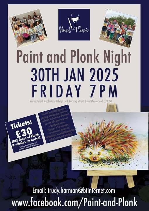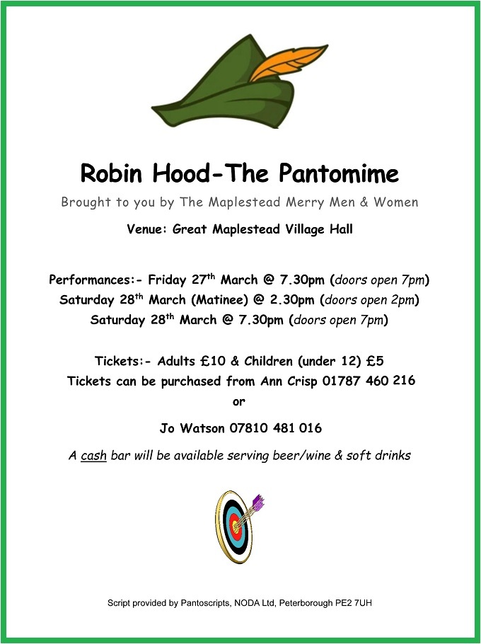 Friday 30th January: Paint and Plonk Night - in the Village Hall. Starts at 7.00pm. This is a just for fun evening, you don’t need to be able to paint! (But you’ll be surprised to see that you can!). There will be a bar, but you get your first drink free. There will also be nibbles included in the price of your ticket! Tickets available from Myra Jeggo (474 285). Poster here Thursday 5th February: Maple Leaves Present: a talk on Hearing Dogs for Deaf People and the benefits of this charity. Starts in the Village Hall at 7.30pm. Entry £3/person for non-members. Everyone is welcome. For more details phone Helen (07890 993 965). Friday 27th/Saturday 28th March: Robin Hood - The Pantomime - in the Village Hall. Friday 27th March: Evening performance @ 7.30pm (doors open 7.00pm). Saturday 28th March: Matinee @ 2.30pm (doors open 2.00pm); Evening performance @ 7.30pm (doors open 7.00pm). Tickets: Adults £10 & Children (under 12) £5 are available from Ann Crisp (460 216) or Jo Watson (07810 481 016). A cash bar will be available serving beer/wine & soft drinks. Poster here Information about other planned future social events can be found on the 'Events' page. |